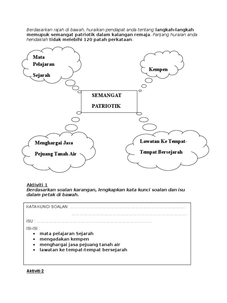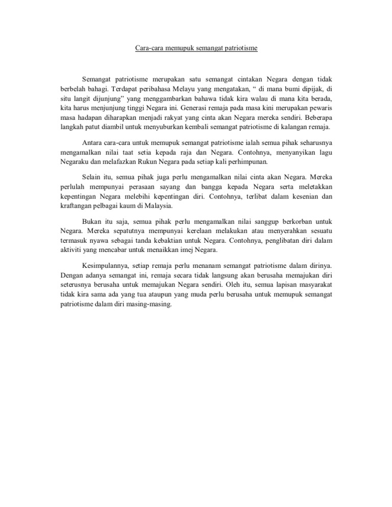 Tulis Pendahuluan Karangan Bagi Tajuk Langkah Langkah Memupuk Semangat Patriotik Dalam Kalangan Remaja Unjumble from az779572.vo.msecnd.net Jika dulu, ayah membawa anak ke tempat sambutan kemerdekaan bagi memupuk semangat kecintaan kepada negara. Kesavarthinee chandran 6 months ago. Tugu negara merupakan lambang penghormatan negara kepada perwira yang mengorbankan jiwa mereka bagi menjaga keamanan negara semangat patriotisme yang tinggi sangat penting bagi setiap rakyat dalam sebuah negara yang merdeka. Melahirkan semangat untuk mempertahankan negara dari ancaman musuh. Kesan patriotisme kepada agama dan masyarakat. Ada banyak literatur yang bisa dilihat untuk memahami mereplikasi cara pandang itu menjadi sangat penting dalam menumbuhkan semangat patriotisme. Untuk memupuk semangat patriotisme dalam diri, ibu bapa juga memainkan peranan penting. Kita sebagai generasi era pasca modenisme, dilimpahi dengan bermacam.