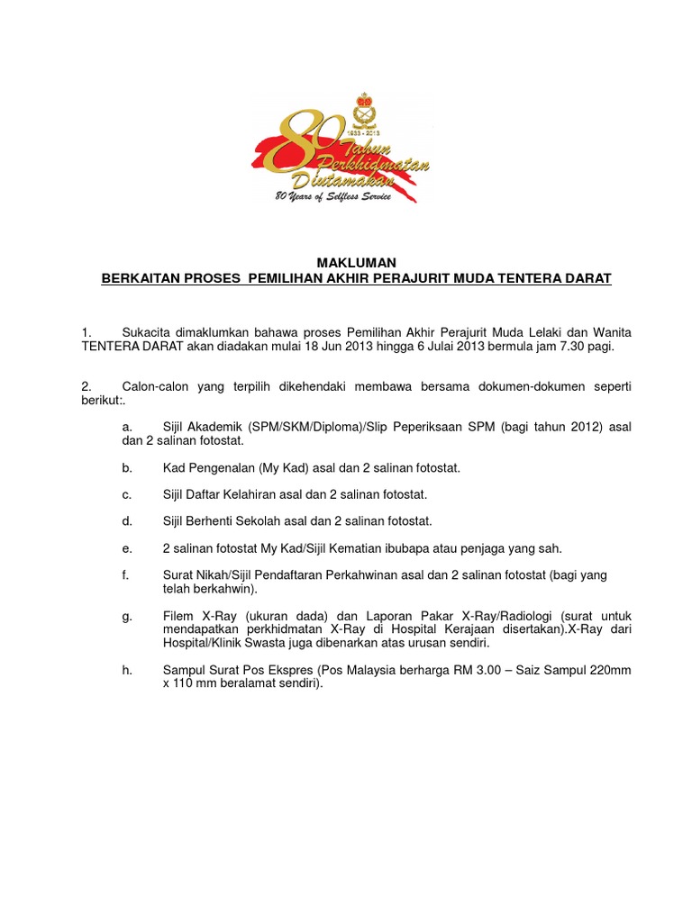 Semakan status kelayakan permohonan permohonan perajurit muda tentera darat 2019 akan diberitahu melalui email pemohon pada tarikh yang akan ditetapkan. Tentera darat malaysia (tdm) mempelawa warganegara malaysia yang berkelayakan dan memenuhi syarat untuk menghadiri sesi pengambilan siri 183/43 tahun 2017. Tentera darat malaysia meliputi beberapa pasukan tempur d an pasukan bantuan tempur yang diberikan tugas mempertahankan tanah air daripada ancaman musuh. Semakan nama bagi pemilihan akhir perajurit muda tentera darat siri 193 tahun 2021. Cabang perkhidmatan dalam angkatan tentera malaysia.